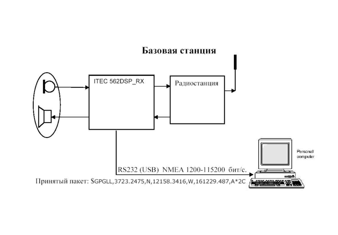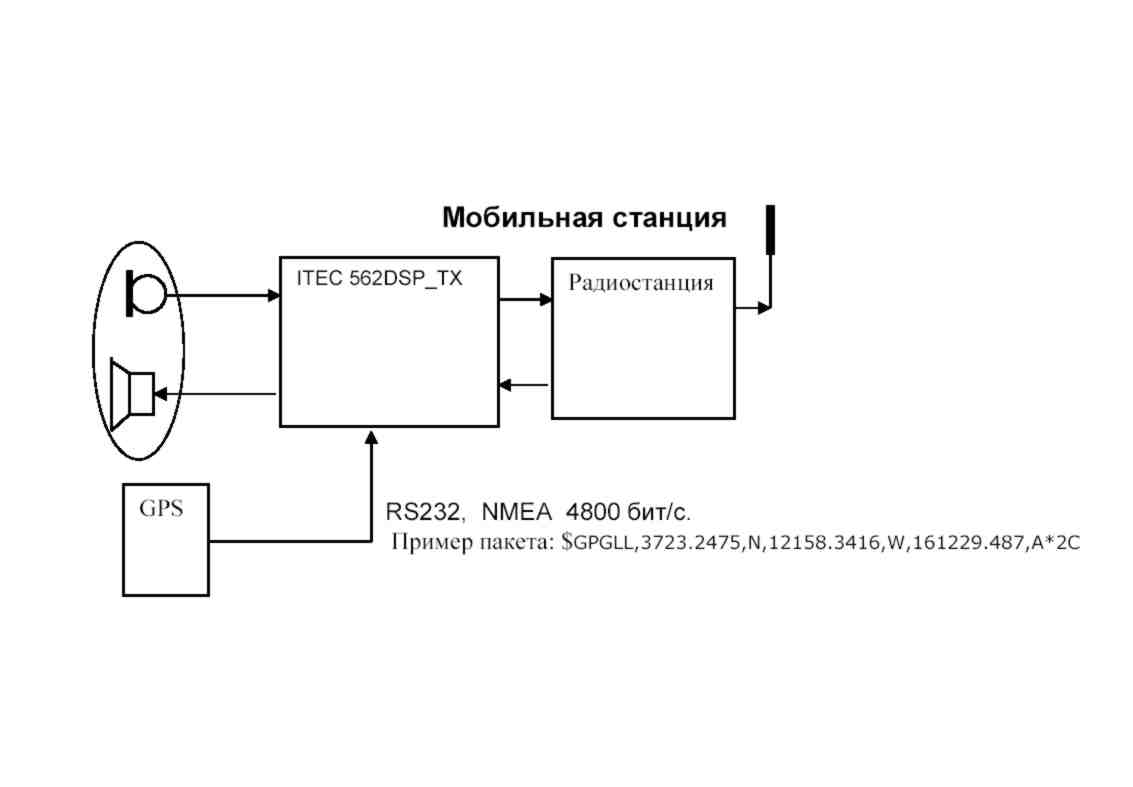 Модем ITEC562DSP_TX предназначен для передачи данных GPS (или другого источника данных) и голосового сигнала на модулятор радиостанции. На приеме модем обеспечивает разделение голоса и данных. Время передачи стандартного пакета координат GPS ~ 0.9 сек. Возможна многократная передача пакетов GPS во время разговора для улучшения надежности передачи.